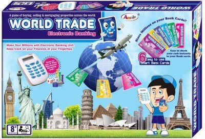 World Trade With Electronic Banking Unit The 21st Century Business Game A Game Of Buying, Selling & mortgaging Properties Across The World. It's a Unique & Well known family game played world wide by different Name which gives you an opportunity to act as International Banker Or Foreign Business man who deals & trades in properties across the world. Make Your Millions with electronic banking unit Keep Track on your finances at your Finger Tips STORE MILLIONS ON YOUR BANK CARDS!! Easy to check your cash instantly in your bank cards. 6 Easy to use smart Bank Cards Easy to use & Play Electronic Banking unit. Contents: 1 Playing Game Board 1 Electronic Banking Unit 6 Playing Smart Bank Cards 6 Pawns 2 Dice 29 Title Deed Cards Houses & Hotels Pawns Easy Instructions!World Trade With Electronic Banking